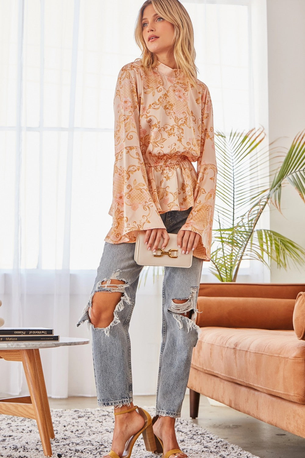 Easy going blouse with bell sleeves and cute back details. High neckline, elastic on the waistline for a flattering fit! Non sheer, woven.