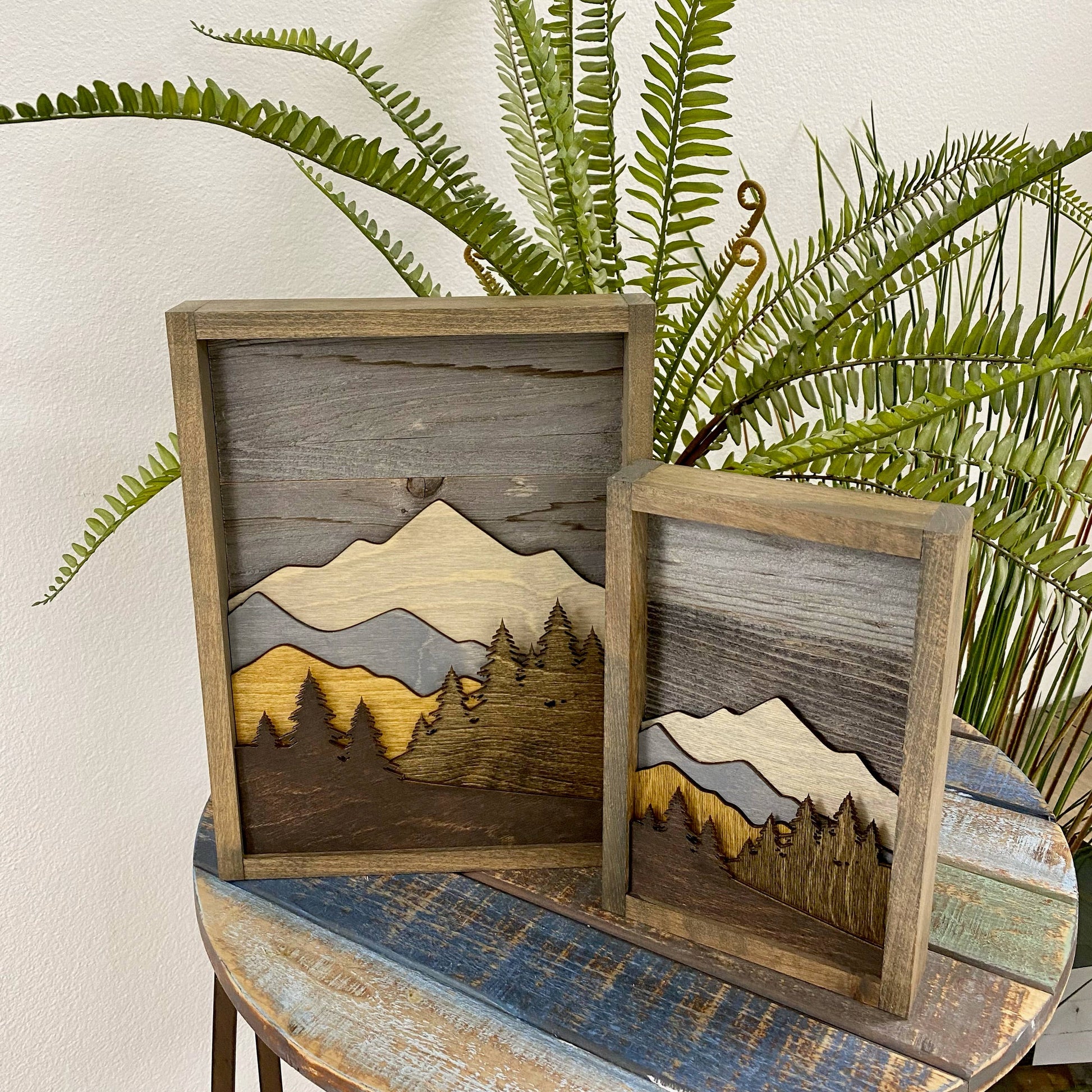 These landscape scenes are made of 5 layers of laser cut 1/8 in. Baltic Birch wood. Each layer is stained to make a beautiful 3D scenic view! Background is made with stained wood and will vary, giving each piece its own unique character. These either hang on the wall or can sit nicely on a desk or table.