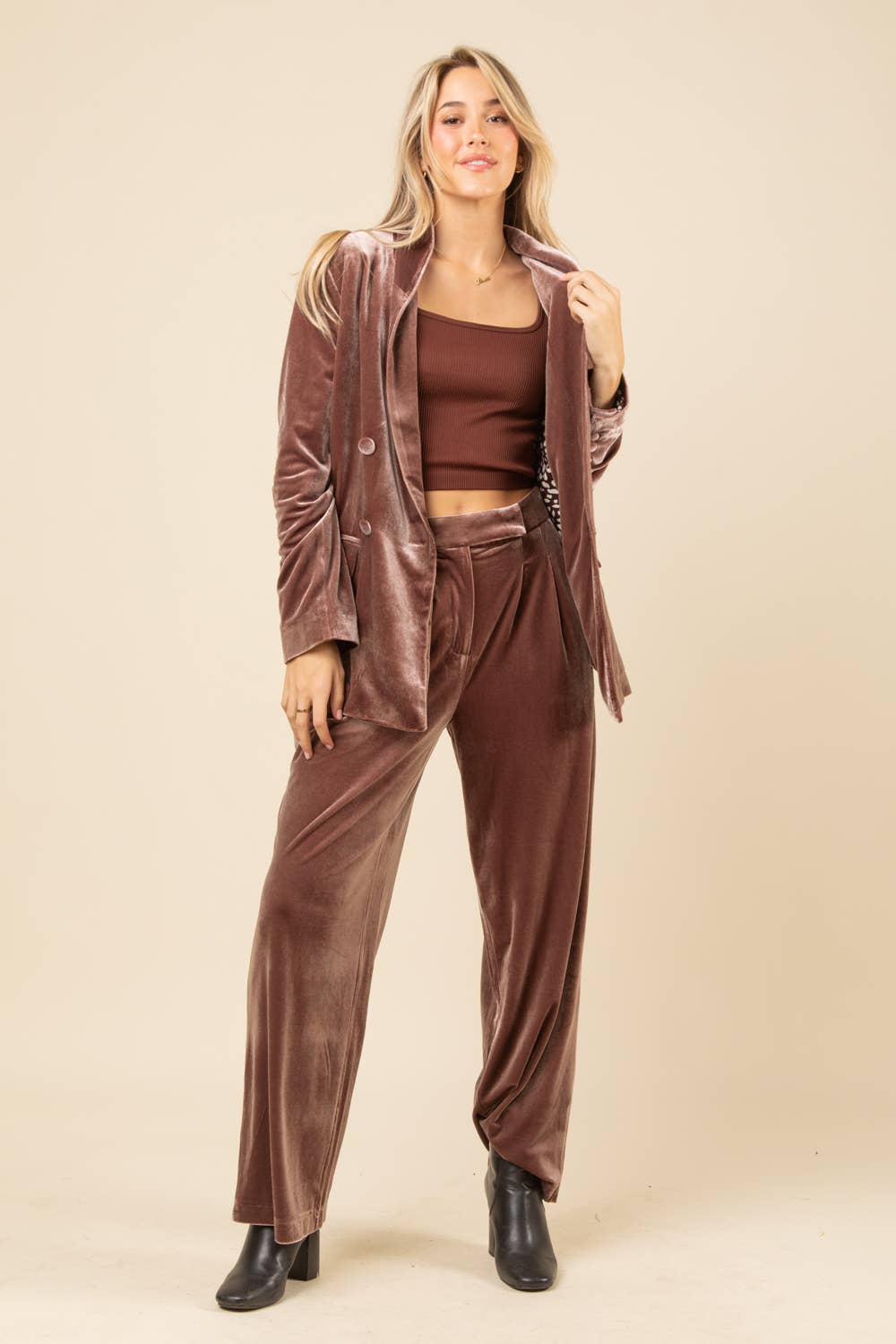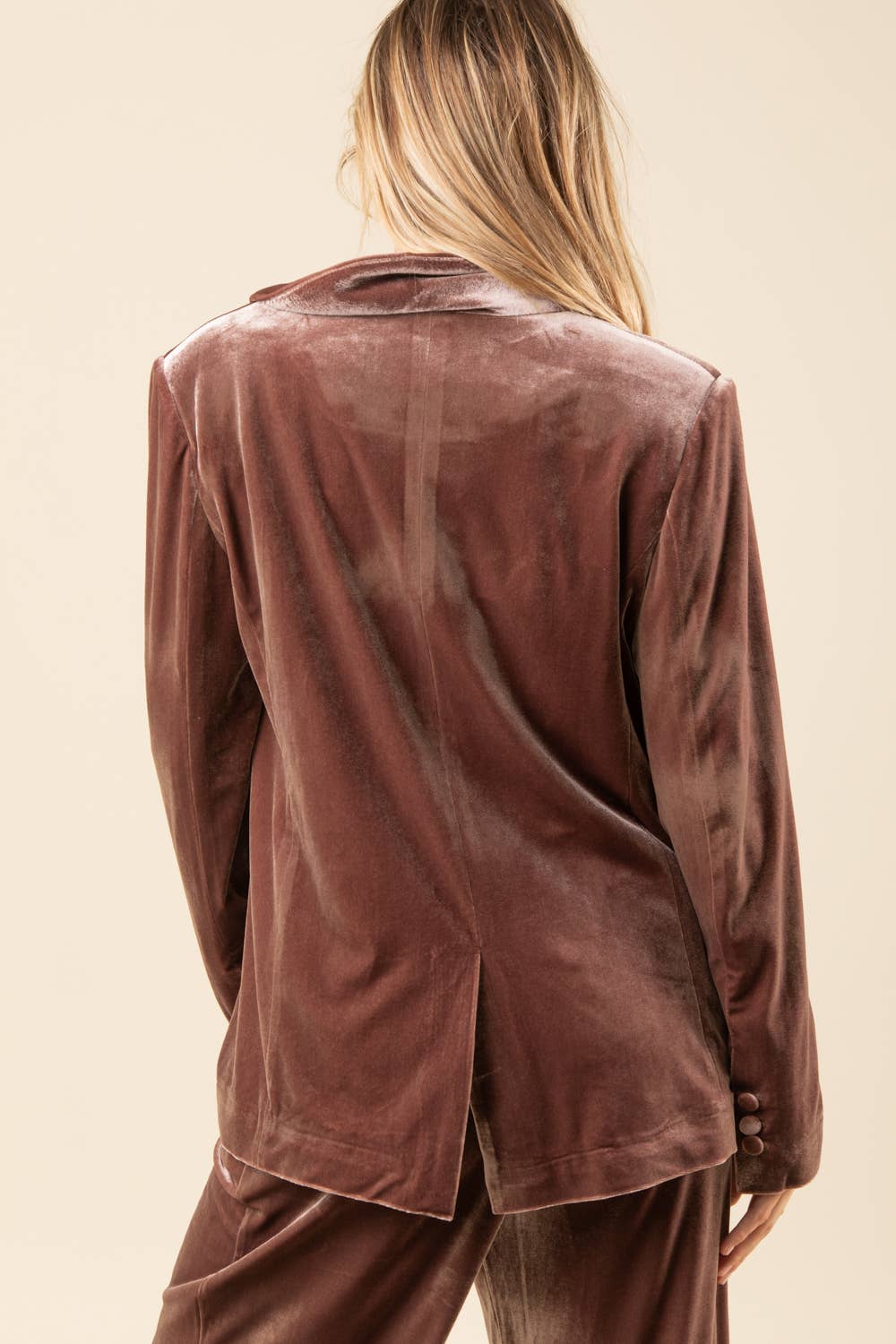 Double Breasted Velvet Holiday Party Jacket - Shacket / Blazer - Shawl Color - Long Sleeve - W/ Contrast Print Lining - Side Pockets - Back Slit Detail - Sleeve Buttons (Model height: 5'9", wearing a Small)