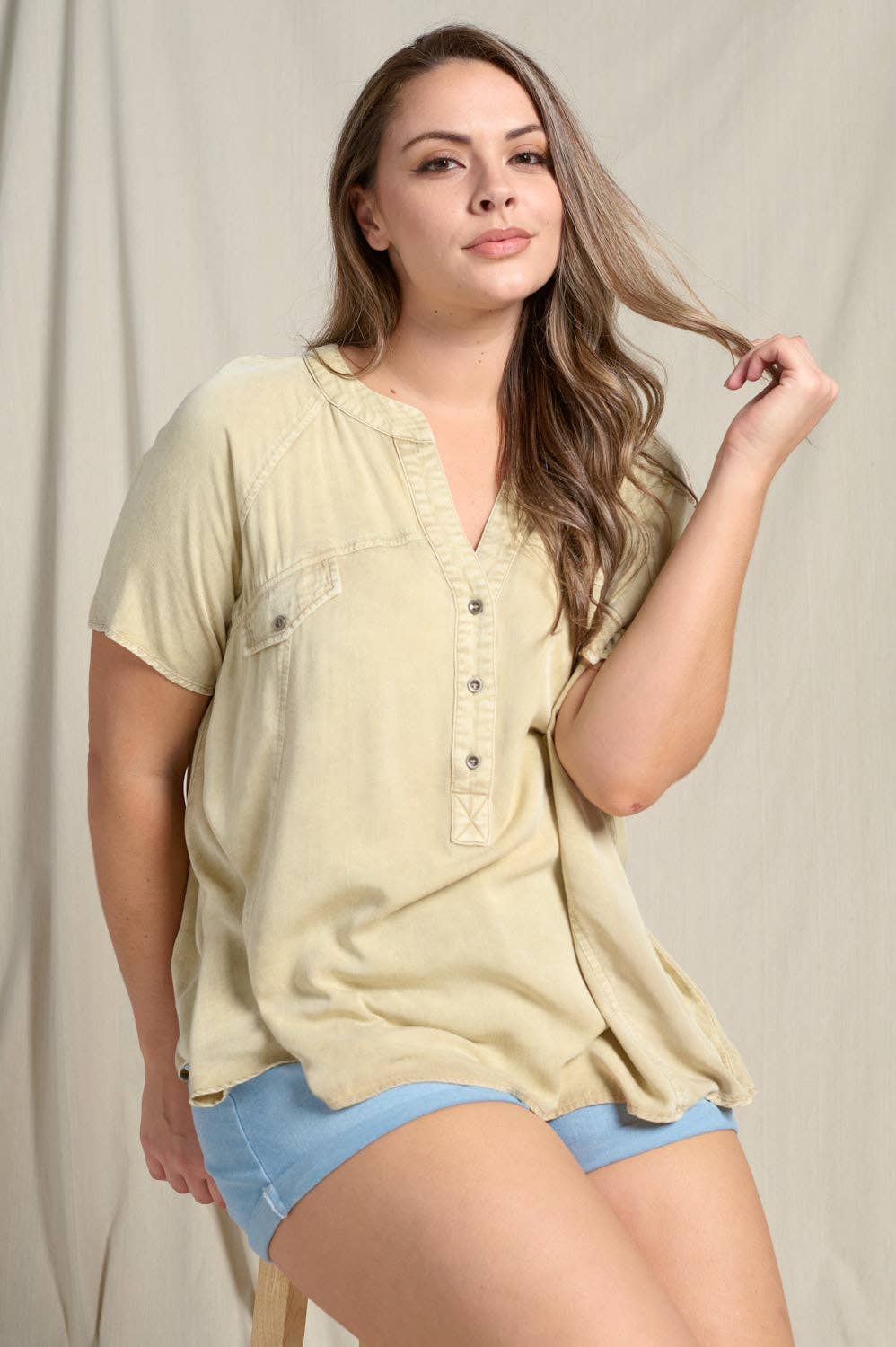 MINERAL WASHED RAGLAN SHORT SLEEVE OVER SIZED HENLEY TOP SELF:100%RAYON TOTAL LENGTH 28"| BUST 24 1/2"| SLEEVE LENGTH 13 1/4"| SHOULDER 33" Model is 5'9" | Bust 41" | Waist 32" | Hips 45" Wearing Size 1X